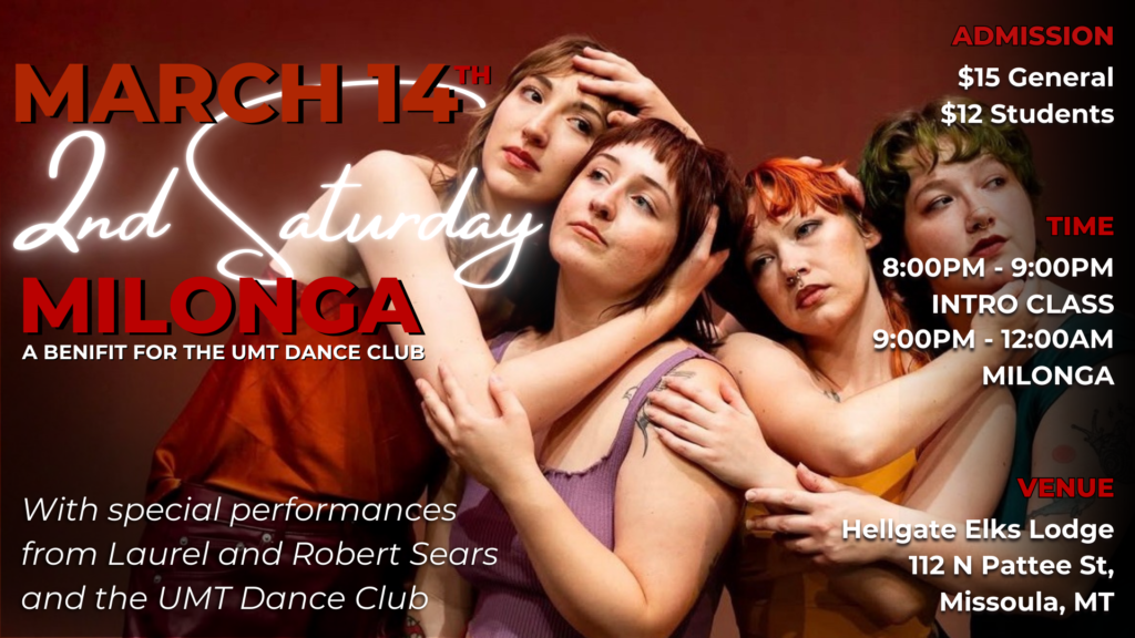 Tango Missoula hosts a Milonga (Argentine tango social dance) every second Saturday of the month. New to tango? Try out the intro class before the milonga at 8:00pm (no partner or experience required).
